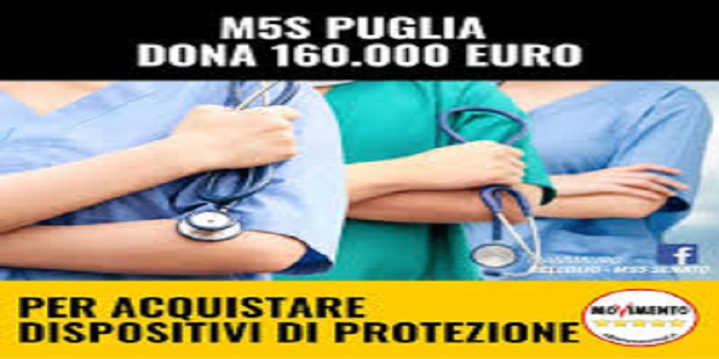 “In questo momento di emergenza per la gestione del coronavirus riteniamo fondamentale dare un contributo per garantire la sicurezza degli operatori sanitari. Abbiamo infatti deciso di destinare i 160.000 euro derivanti dal taglio dei nostri stipendi all’acquisto di dispositivi di protezione per le 1100 guardie mediche pugliesi e i medici del territorio”. Lo annunciano i consiglieri del M5S Puglia. Una prima tranche dei 160.000 euro accantonati è servita ad ordinare 1100 tute protettive, 4400 mascherine ffp2 e 4400 gel igienizzanti antibatterici per le mani, 2100 occhiali di plastica, che saranno consegnati il prossimo fine settimana.
