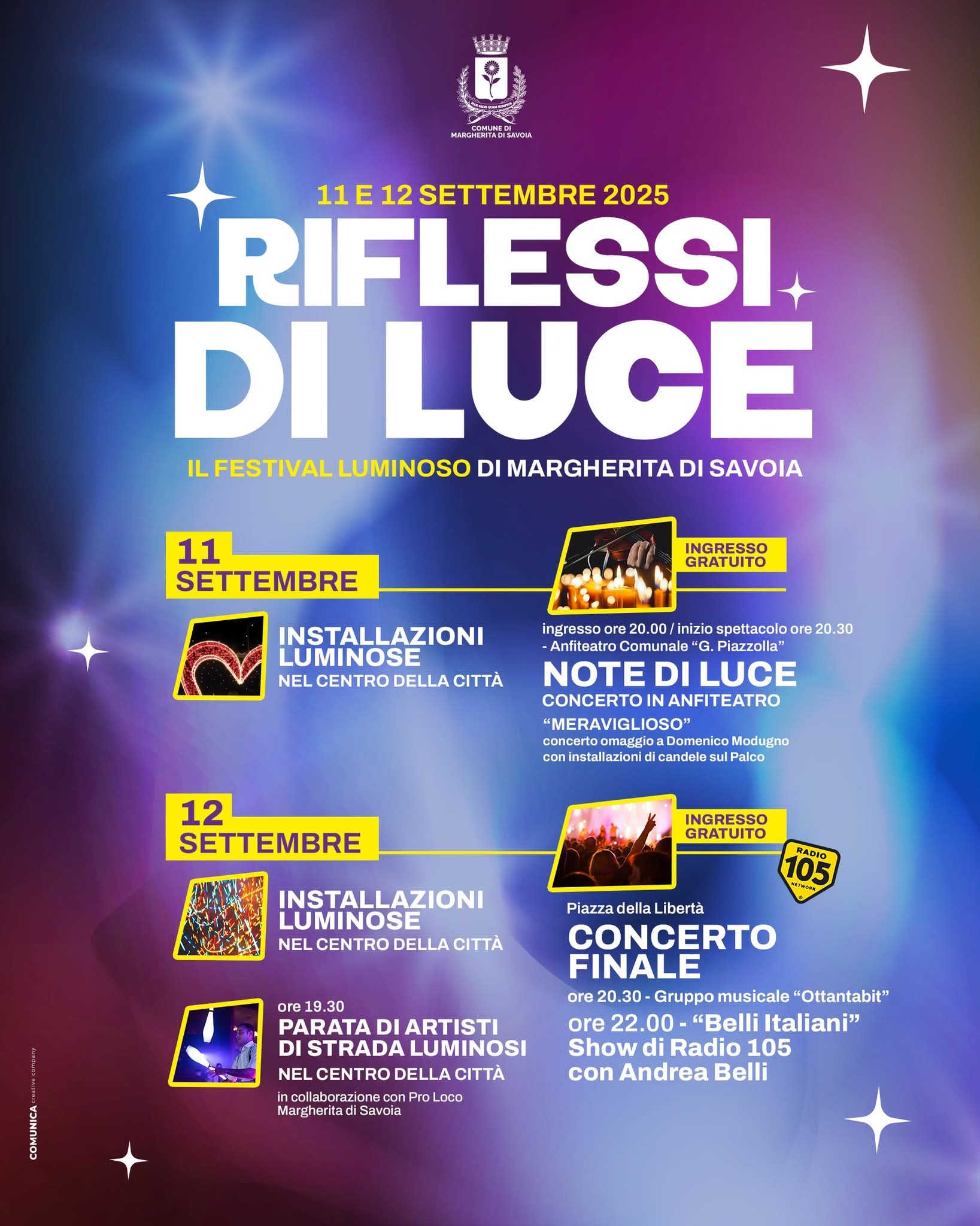 “Con Riflessi di Luce vogliamo consegnare alla città un evento capace di farci sentire uniti, orgogliosi e vivi” – commenta il Sindaco, Avv. Bernardo Lodispoto. “Settembre diventa così un mese di festa e di opportunità, un ponte tra la stagione estiva e nuove prospettive di crescita turistica e culturale”.
