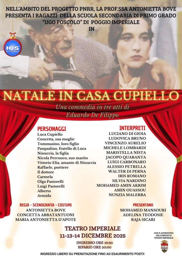 Nell’ambito del Progetto PNRR, la prof.ssa Antonietta Bove presenta i ragazzi della Scuola Secondaria di 1° grado “Ugo Foscolo” di Poggio Imperiale in “Natale in Casa Cupiello” una commedia in tre atti di Eduardo De Filippo.
