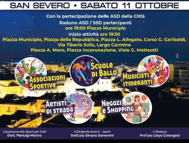 Un’intera serata all’insegna dello sport, del divertimento e della partecipazione collettiva. È questo lo spirito della “Notte Bianca con lo Sport per Tutti”, promossa dal Comune di San Severo – assessorato allo Sport per Tutti, in programma sabato 11 ottobre 2025.