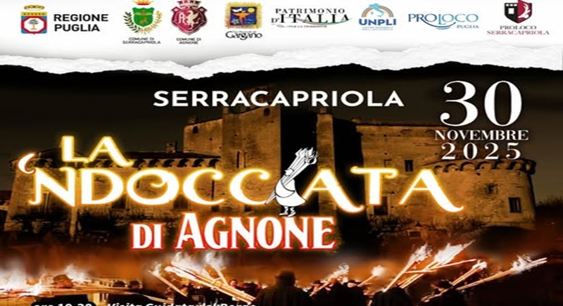 La ” Ndocciata di Agnone” è un evento tradizionale che si tiene ad Agnone (IS) nel Molise, ma il 30 Novembre 2025 saranno anche a Serracapriola con una sfilata di enormi torce a forma di ventaglio chiamate ‘ndocce, realizzate con tronchi d’abete.