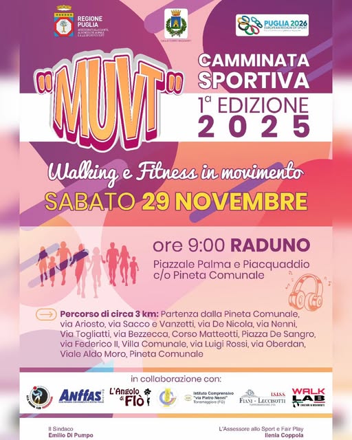 L’assessorato allo sport del comune di Torremaggiore, rispondendo al Bando della Regione Puglia AVVISI B per le manifestazioni sportive, e con cofinanziamento comunale, propone una camminata Sportiva in cui si associano walking, fitness, musica e benessere.