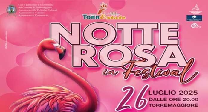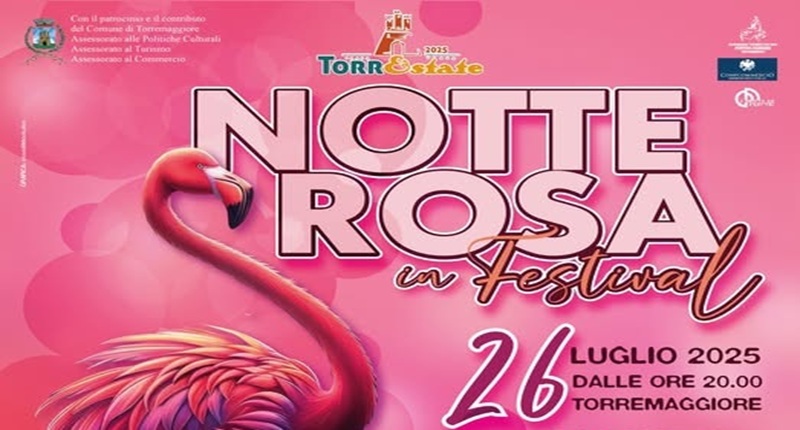 Il Comune di Torremaggiore è lieto di annunciare il ritorno della Notte Rosa in Festival, uno degli appuntamenti più attesi dell’estate, in programma sabato 26 luglio 2025 a partire dalle ore 20.00 nel cuore della città, tra Piazza Incoronazione, Corso Matteotti e Piazza Giovanni Paolo II.