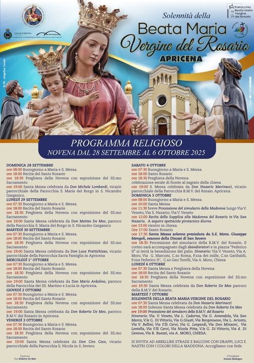 ApricenaEventi APRICENA, SOLENNITA’ DELLA BEATA VERGINE MARIA DEL ROSARIO By Redazione - 13 Settembre 2025 0 172 FacebookTwitterPinterestWhatsApp Si pubblica il programma religioso della Beata Vergine Maria del Rosario che si festeggia nella cittadina di Apricena.
