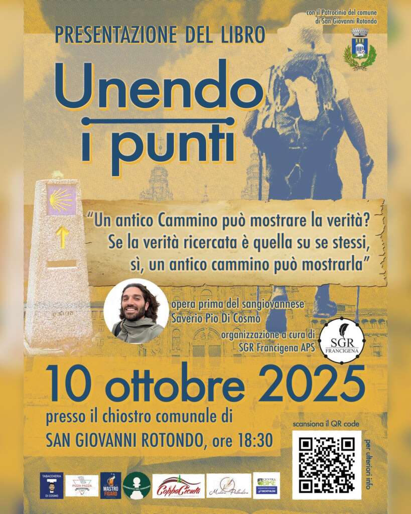L’Associazione San Giovanni Rotondo Francigena è lieta di annunciare l’evento di presentazione del libro “Unendo i Punti”, opera prima del giovane autore Saverio Pio Di Cosmo. L’incontro si terrà venerdì 10 ottobre alle ore 18.30 presso il Chiostro Comunale di San Giovanni Rotondo.