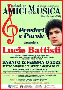 Sabato 12 febbraio 2022, nella magnifica cornice del Teatro Verdi, Cristian Levantaci e l’Orchestra Sound Ensemble ci faranno ascoltare le più belle canzoni dell’indimenticabile Lucio Battisti.