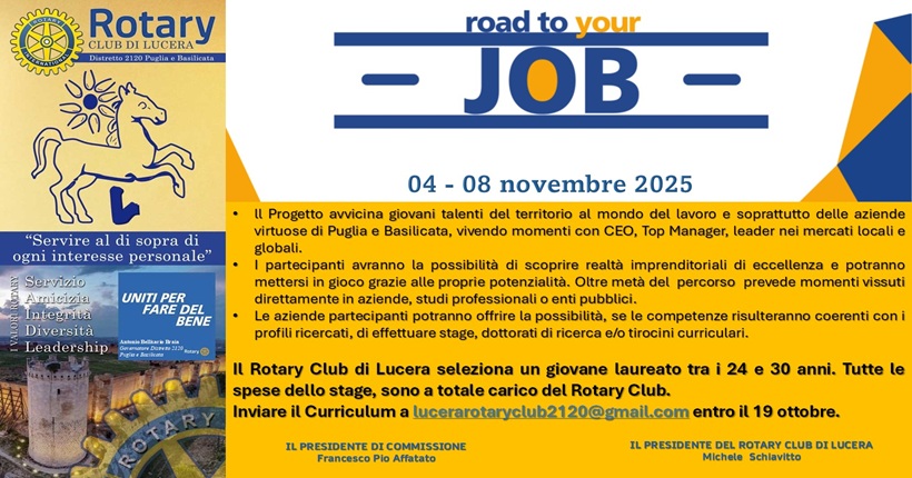 Il Rotary Club di Lucera, presieduto dal Michele Schiavitto, parteciperà selezionando uno dei 30 giovani di eccellenza provenienti da tutta la Puglia e la Basilicata, che prenderanno parte a questo progetto esclusivo.