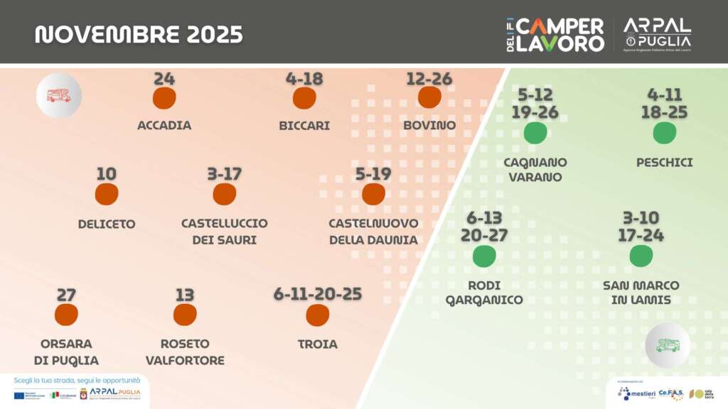Nel frattempo, il primo Camper, già operativo da diversi mesi nei Comuni dei Monti Dauni — Troia, Orsara di Puglia, Bovino, Accadia, Biccari, Castelnuovo della Daunia, Roseto Valfortore e Volturino — continuerà il suo viaggio incontrando la cittadinanza interessata a conoscere servizi per l’impiego. Da ottobre a dicembre, il suo percorso si arricchirà inoltre di due nuove tappe: Castelluccio dei Sauri e Deliceto.