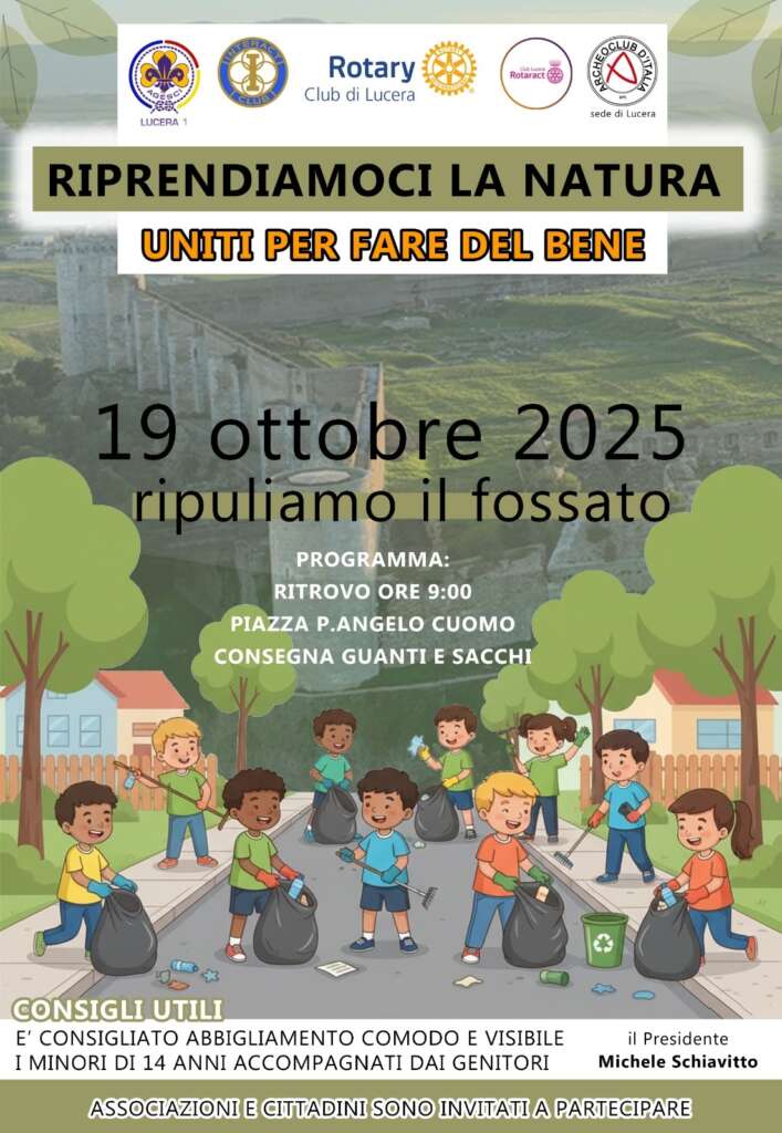 Il Rotary Club di Lucera scende in campo con un’iniziativa dedicata al decoro urbano e alla sensibilizzazione civica: “Ri-puliamo il Fossato”, in programma domenica mattina alle ore 9:00 presso il fossato della città.