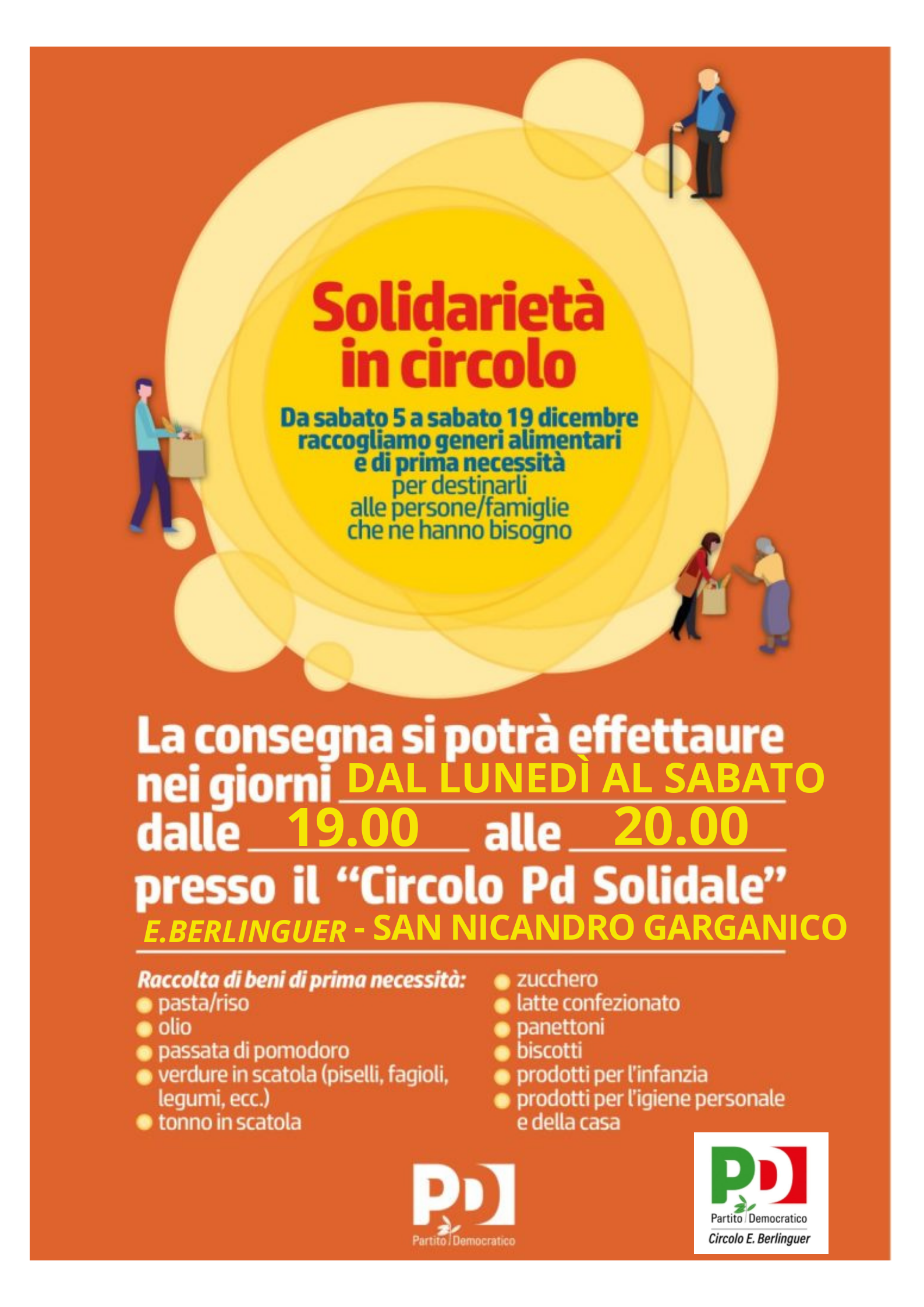 Da sabato 5 a sabato 19 dicembre, infatti, tutti i circoli del PD raccoglieranno beni alimentari di prima necessità per destinarli, a chi ne ha più bisogno.