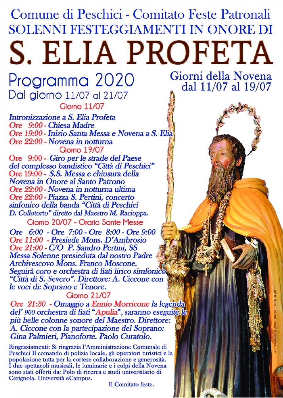 Tutti noi sappiamo che la situazione economica e sociale che stiamo attraversando non ci avrebbe permesso di fare festeggiamenti simili alla scorsa edizione, ma non potevamo esimerci nel dare a Voi popolo Peschiciano ed ai nostri carissimi turisti, infinitamente generosi e devoti al nostro Santo Patrono Elia, di offrirvi quel senso di festività e devozione al quale tutti siamo immensamente legati.