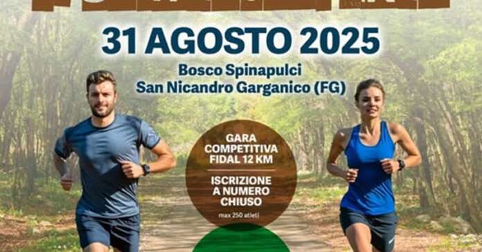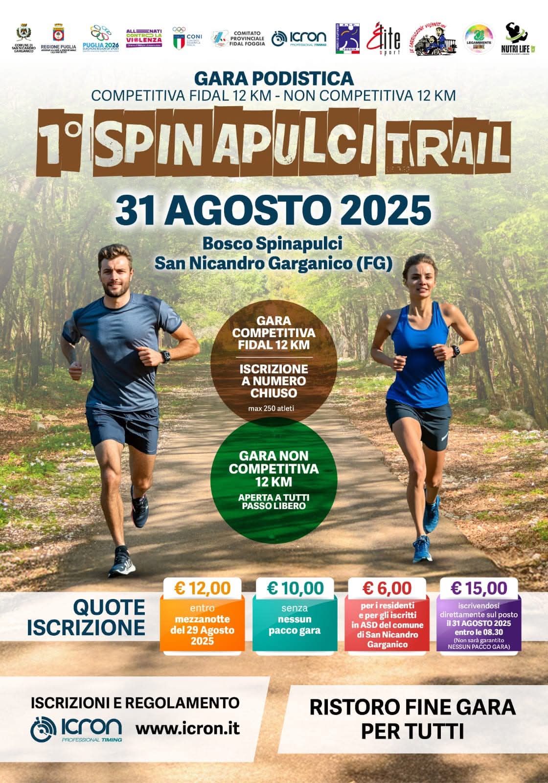 Sport SAN NICANDRO GARGANICO, GARA PODISTICA “1^ SPINAPULCI TRAIL” By Redazione - 16 Agosto 2025 0 213 FacebookTwitterPinterestWhatsApp San Nicandro Garganico: 12 km competitiva e non. Domenica 31 agosto, partenza ore 9:30 dall’ECO RESORT LE TRE CERCOLE (Bosco Spinapulci) https://maps.app.goo.gl/7T3TYabN5QyC9m479?g_st=ipc Premiazioni 1^ Spinapulci Trail 12 km Previsti anche rimborsi spese individuali e di società https://www.icron.it/newgo/#/evento/20254393