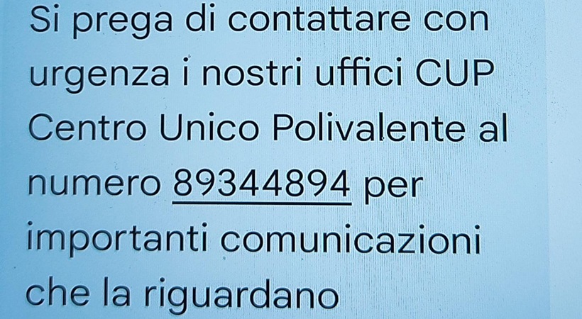 Ultimamente stanno arrivando dei messaggi che sembrano inviati dal CUP dell’ASL ma che in realtà sono una truffa il cui scopo è svuotare il credito sul telefono (VEDI FOTO ALLEGATA ALL’ARTICOLO).