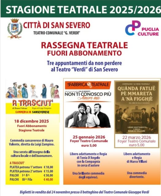 Tre appuntamenti da non perdere, tre spettacoli che uniscono tradizione, comicità e talento locale: è la Rassegna Teatrale Fuori Abbonamento promossa dal Teatro Comunale “Giuseppe Verdi” di San Severo, nell’ambito della stagione 2025/2026.