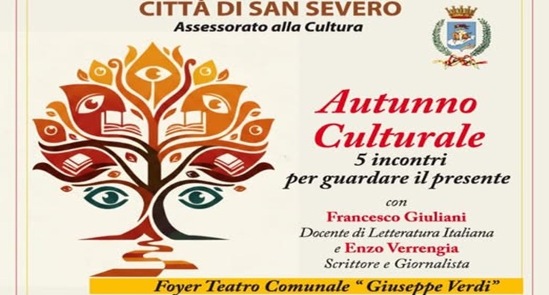 San Severo – Prenderà il via mercoledì 26 novembre alle ore 18:00, presso il Foyer del Teatro Comunale “Giuseppe Verdi”, la prima edizione della rassegna “Autunno Culturale – 5 incontri per guardare il presente” promossa dalla Città di San Severo – Assessorato alla Cultura.