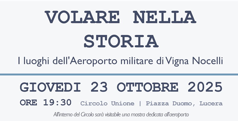 Giovedì 23 ottobre alle ore 19:30, presso il Circolo Unione di Lucera, si terrà la presentazione “Volare nella storia. I luoghi dell’Aeroporto militare di Vigna Nocelli”, un incontro dedicato alla riscoperta di una pagina poco conosciuta della storia della Capitanata: quella legata agli aeroporti militari sorti nel territorio durante la Seconda guerra mondiale e, in particolare, al campo di Vigna Nocelli, oggi completamente scomparso ma un tempo parte integrante del grande complesso aereo alleato di Foggia.